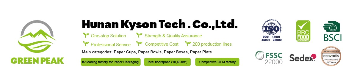 Hunan Kyson Tech.Co., Ltd., it is an enterprise focusingon manufacturing and exporting of biodegradablepaper products.Our factory is Changsha,Hunan,China.covering an area of 50 acres with a construction areaof over than 60,000 square meters, which enjoys aunique water transportation routes,leading to all partsof the world.Kyson factory has more than 20 advancedintegrated production lines of intelligent production anddefect detection in China, with an annual production of800.000 boxes.